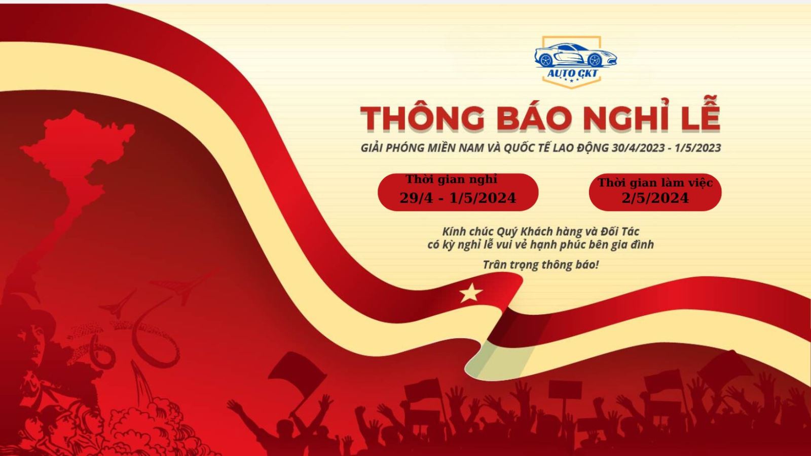 AUTOCKT xin trân trọng thông báo lịch nghỉ lễ Ngày giải phóng miền Nam thống nhất đất nước 30/4 và Quốc tế lao động 1/5 năm 2024 đến Quý khách hàng như sau: